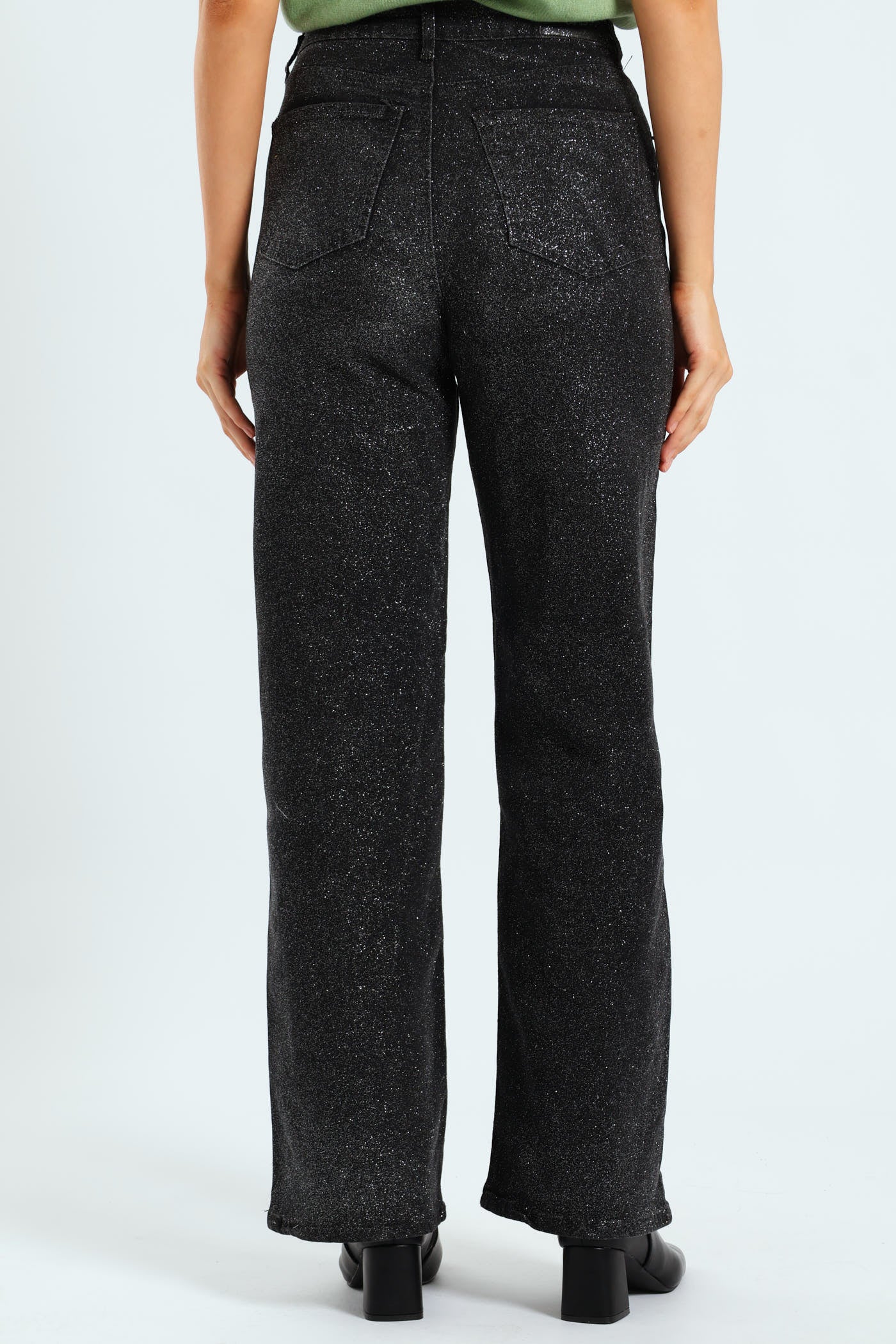 Make a dazzling statement with these black glitter wide-leg jeans, designed to add a touch of glam to any outfit. Crafted in a structured denim blend with shimmering metallic threads, these jeans offer a flattering high-rise fit and relaxed wide-leg silhouette that moves elegantly from day to night. The subtle sparkle elevates the jeans into party-ready territory, while classic five-pocket styling and a zip-button closure ensure practicality and comfort.